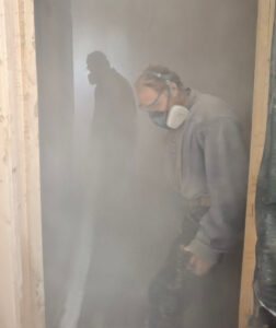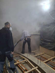 Nachdem das Gerüst für den Bodenaufbau hergestellt war, erfolgte die Einblasung der Trittschalldämmung. Ein Gewerk das von langer Hand vorbereitet wurde, da die Entscheidung zwischen „2.800 Säcken je 25 kg vertragen“ und der Einblasmöglichkeit mit extremer Staubentwicklung getroffen werden mußte. Ronald, Daniel und Thomas haben sich für die Einblasvariante entschieden und alle waren froh, als es geschafft war.