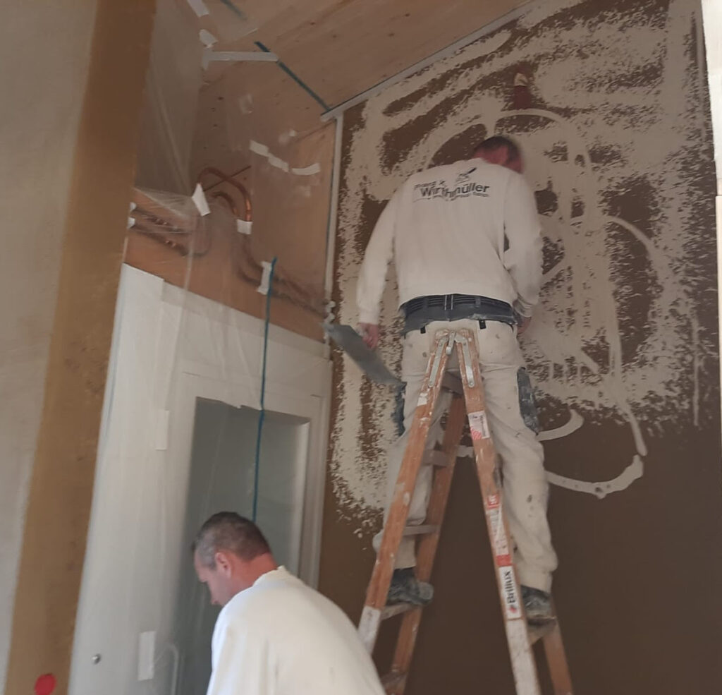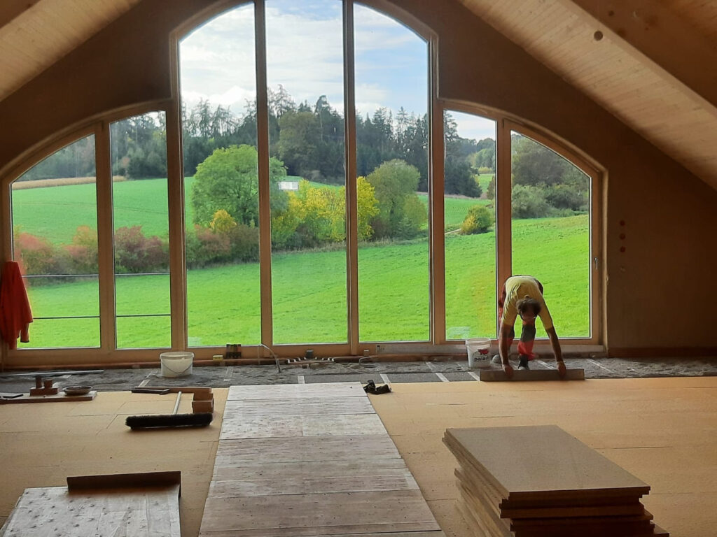 Während wir nun auf den Zuschuss für das „energieeffiziente bauen“ warten, laufen die Arbeiten weiter. Momentan sind die Lehmputzer dabei, den Feinputz aufzutragen.