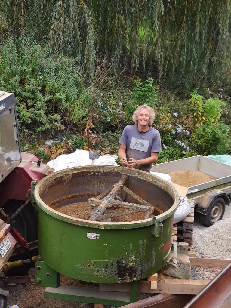 Ein weiteres besonderes Gewerk ist die Stampflehmwand, die den Eingangsbereich rahmt. Auch da gab‘ es im Vorfeld schon einige Vorbereitungen: Ein Teil des Lehms wurde von unserem Grundstück verwendet.