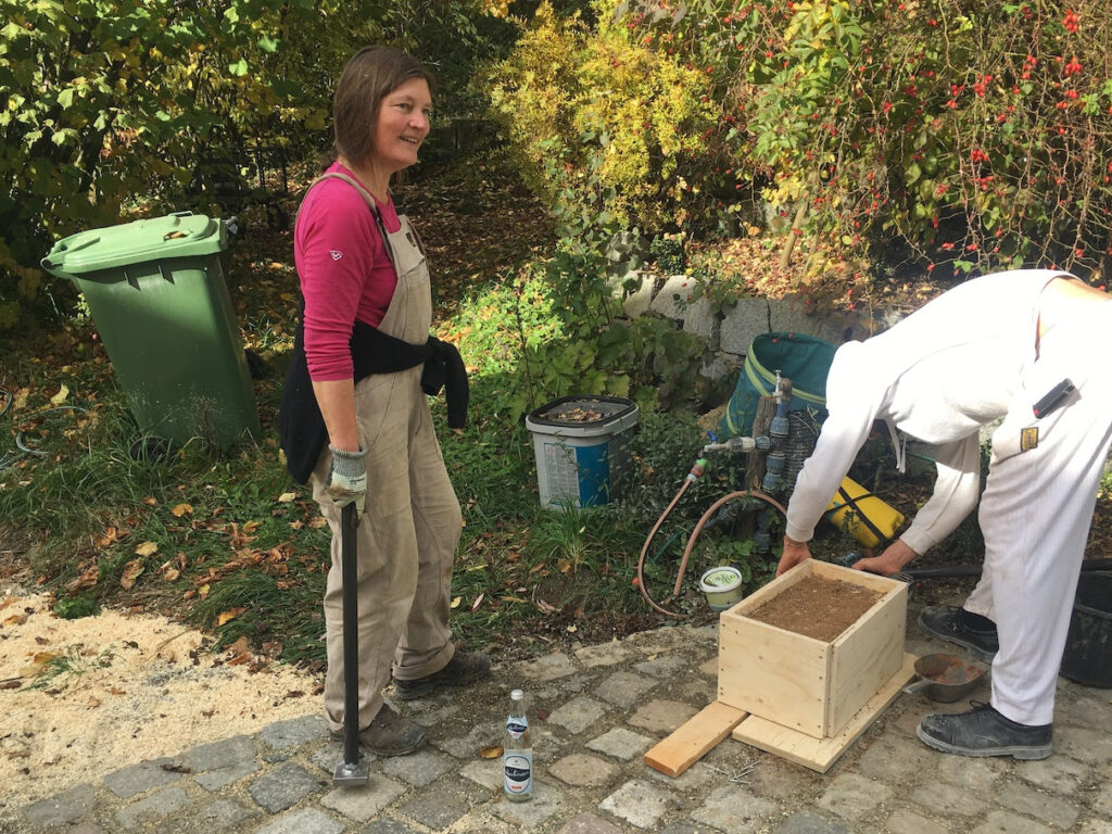 Dann wurden die ersten Teile der Schalung aufgestellt…..nochmal die letzten Muster angefertig….Christine und Lewe waren eine ganze Woche mit dabei, um Alois zu unterstützen….